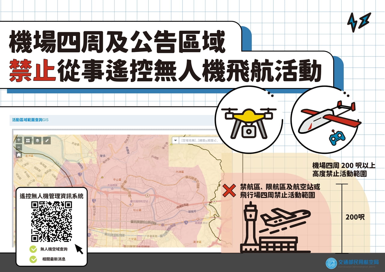1、機場四周及公告區域禁止從事遙控無人機飛航活動:民用航空局已將遙控無人機圖資資料匯入「遙控無人機管理資訊系統(https://drone.caa.gov.tw/)」,包括禁航區、限航區、航空站或飛行場四周之一定距離範圍與直轄市、縣(市)政府規劃之公告區域及代中央主管機關公告認有禁止或限制活動之區域等圖資。另亦已建置行動裝置應用程式(Drone Map 2.0),搭配行動裝置之地理定位功能,可提供無人機操作人更精確知曉遙控無人機活動區域相關規定,請多加下載使用。